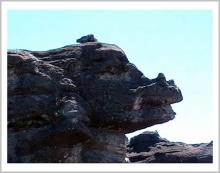 Пик вроде совсем недалеко от нашего лагеря, разбитого под скальным навесом у входа в какую-то пещеру на самом краю «Затерянного мира». Но добраться до него без проводника оказалось совсем не просто. Пришлось долго плутать, обходя каменные завалы, скальные разломы и небольшие болота. Когда подошли к вершине – все заволокло туманом и тропу наверх мы не нашли. Неожиданно увидели небольшую человеческую фигурку на гребне.